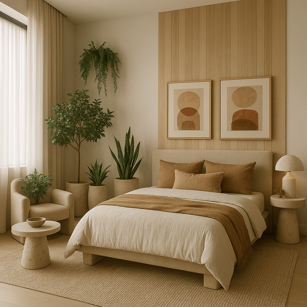 Connect your Japandi bedroom to nature by incorporating plants and natural elements: