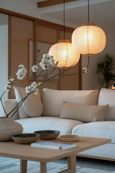 - Rice paper lamps- Rice paper lamps have been gaining traction online lately, but their origin stems from a Japanese tradition that focuses on the use of natural materials to enhance living spaces. These lamps can be crafted into various shapes and sizes, such as oval, rectangular, circular, and even abstract forms, making them an easy fit for our Japandi style homes. When illuminated with soft yellow lighting, they create a serene and stunning atmosphere.