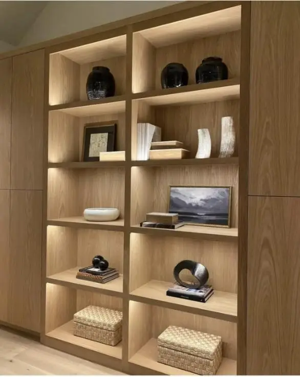 - Hidden décor – In Japandi design, it’s commonly practised to establish an open-close concept in storage solutions to achieve balance in tall storage units. Therefore, on open shelves, aim to display high-quality, timeless items such as a vase, a book holder, a few candles, or some crockery, which also serve as impressive decorative elements.