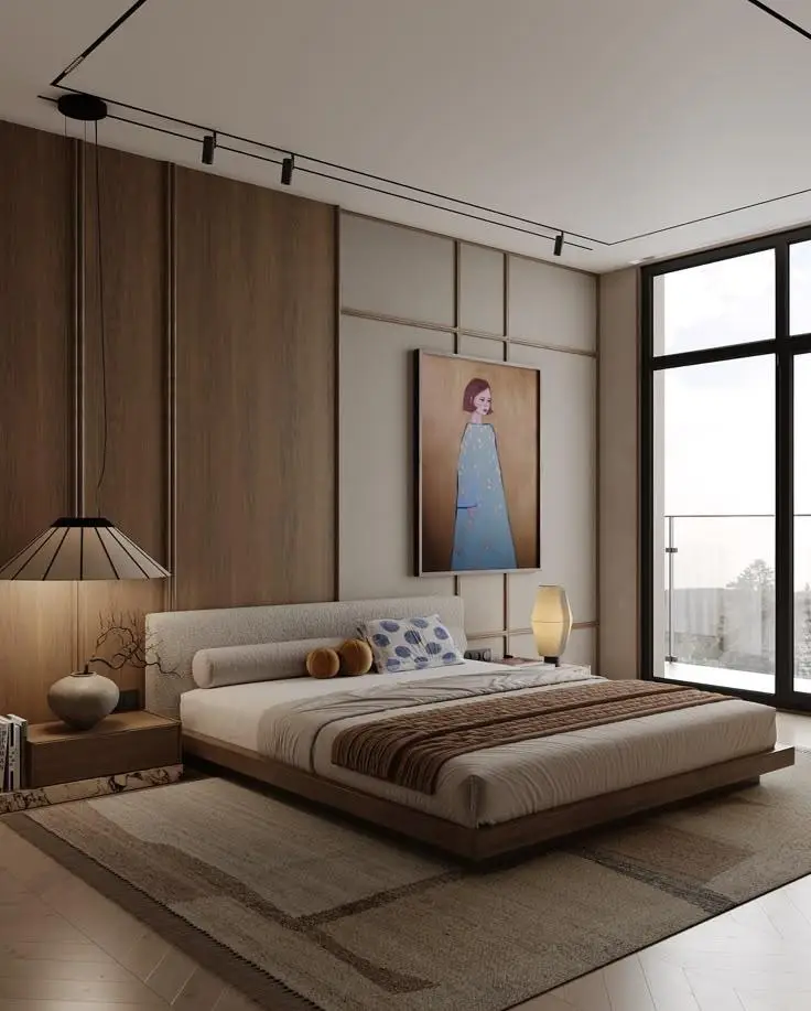 The design of a Japandi bedroom combines tranquil simplicity with practicality. The image provided exemplifies this concept beautifully, beginning with a warm, clean wooden floor that sets the tone, followed by a low-profile Japanese bed crafted from the same wood, serving as a backdrop. You can choose to maintain a minimal aesthetic by incorporating some accent artwork or a painting for a splash of colour and dimension, or opt for rich wooden panelling, complemented by a striking hanging light fixture. To achieve a tidy appearance, opt for tall and clean Japandi storage or wardrobe designs that match the wood used in the walls, creating a harmonious and clutter-free atmosphere. Finish the space with tatami floor mats and textured area rugs for added coziness.